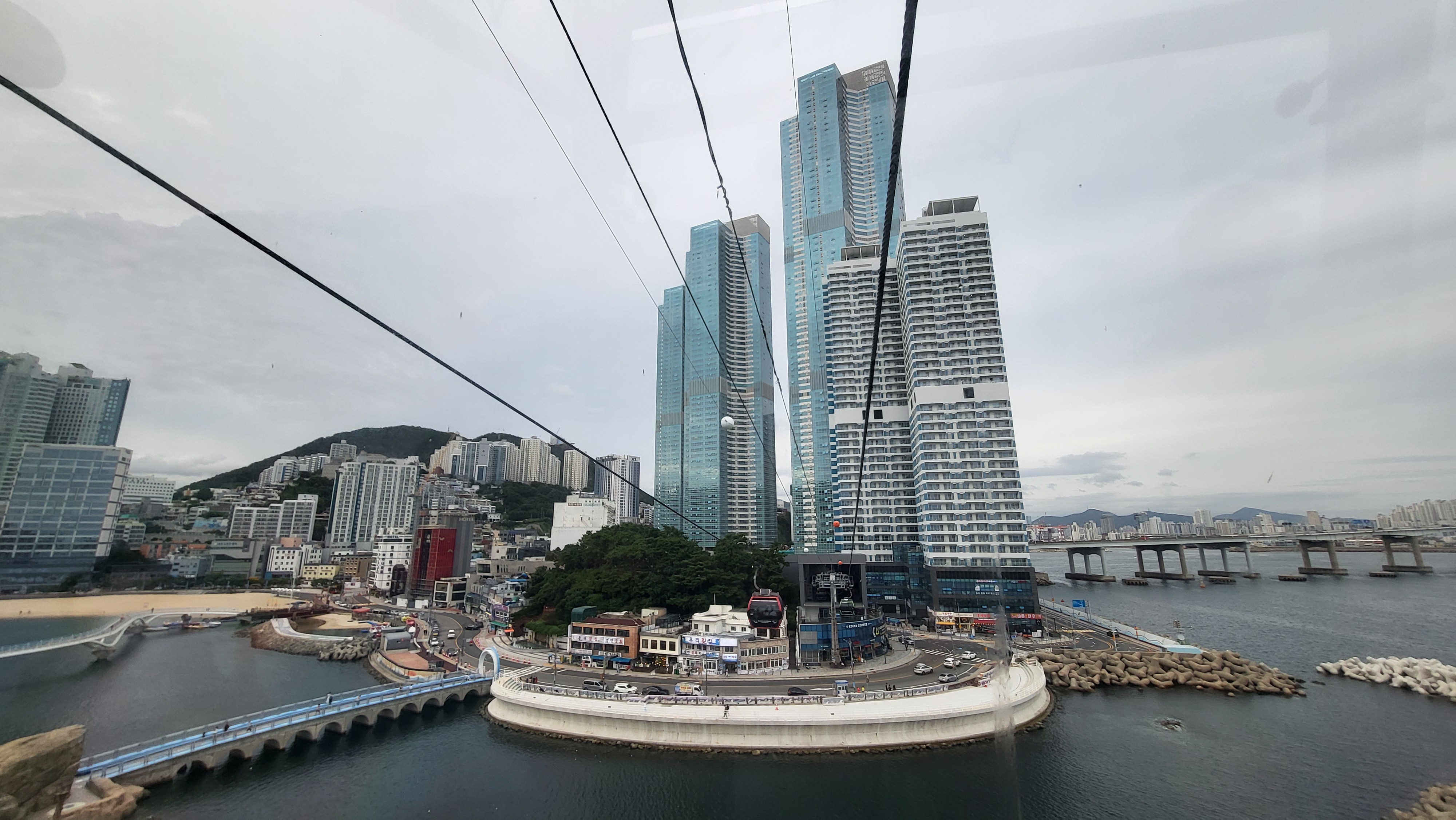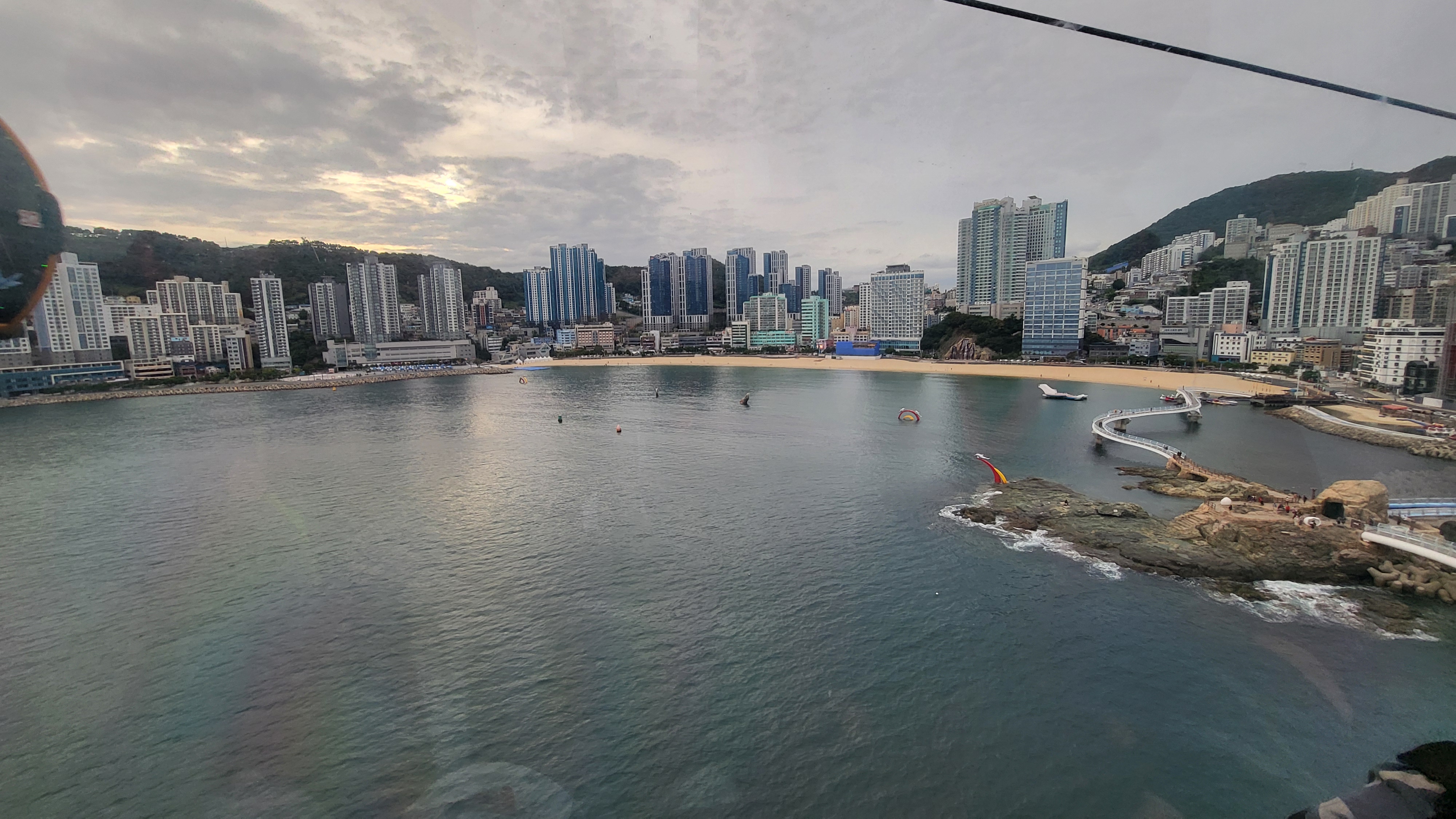 케이블카 안에서 오른쪽으로 보이는 송도해수욕장과 아파트 단지들.