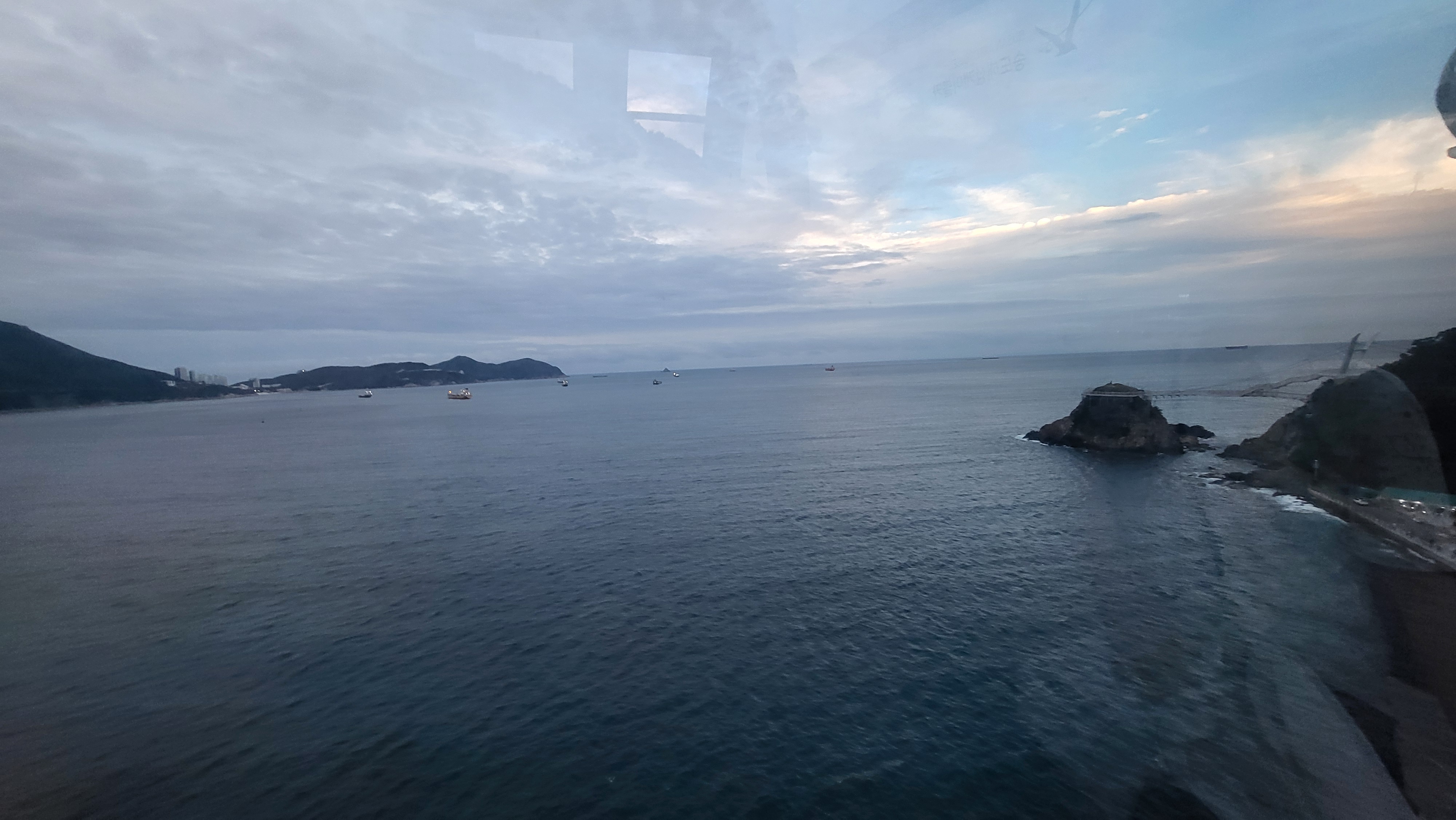 해상케이블카를 타고 나가면서 뒤돌아본 두도와 송두용궁구름다리, 그리고 송도 앞 먼바다 풍광.