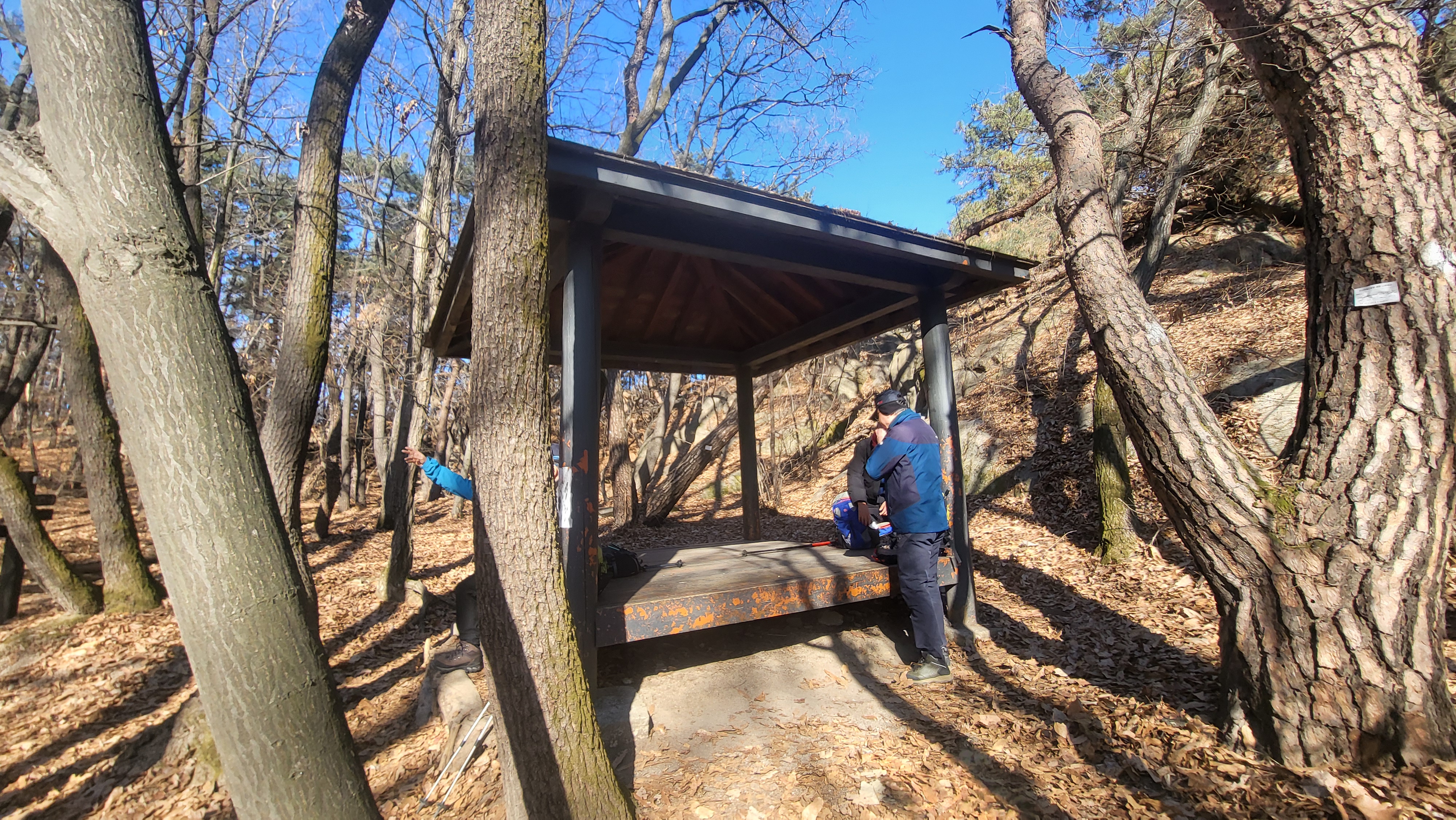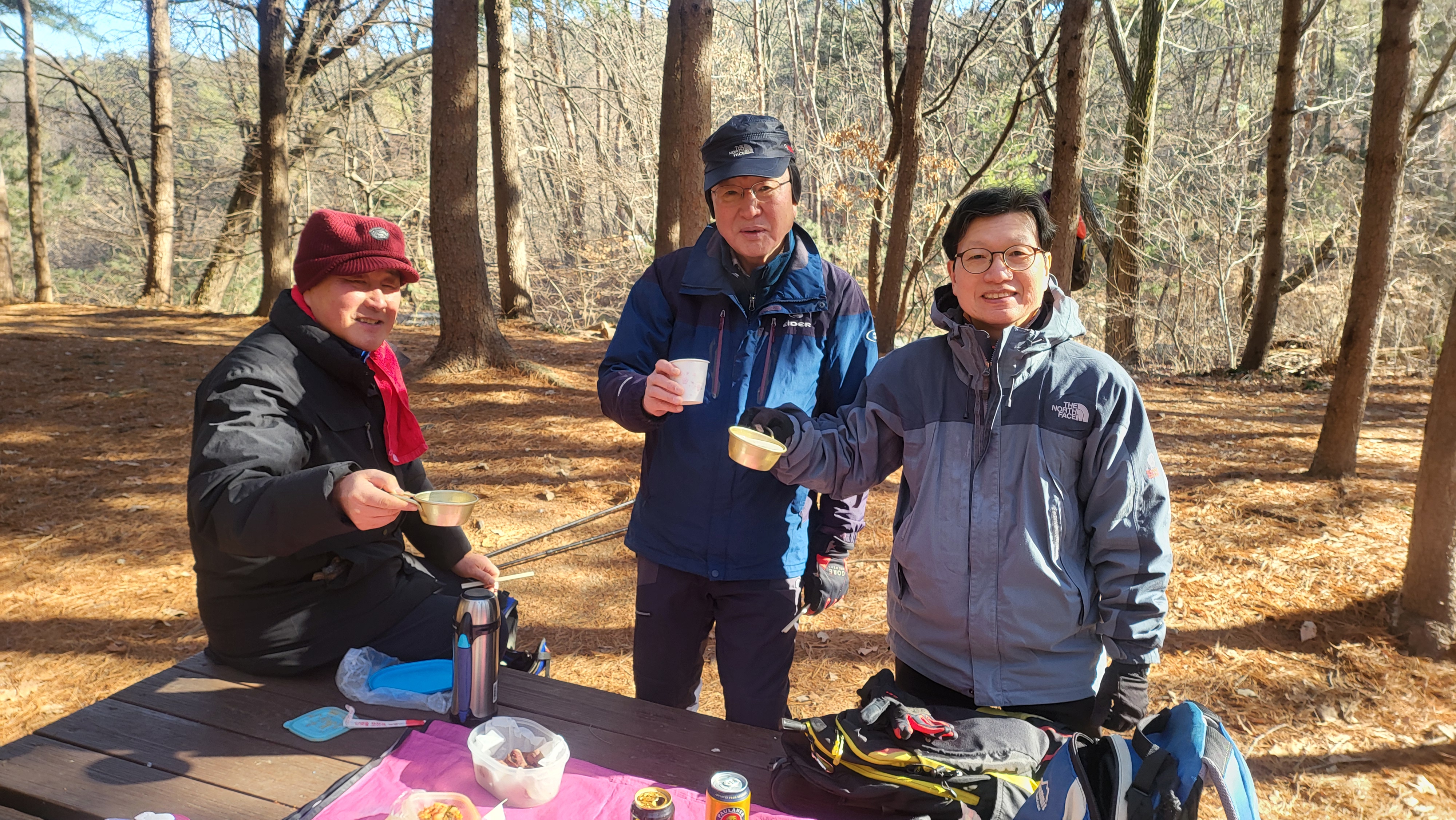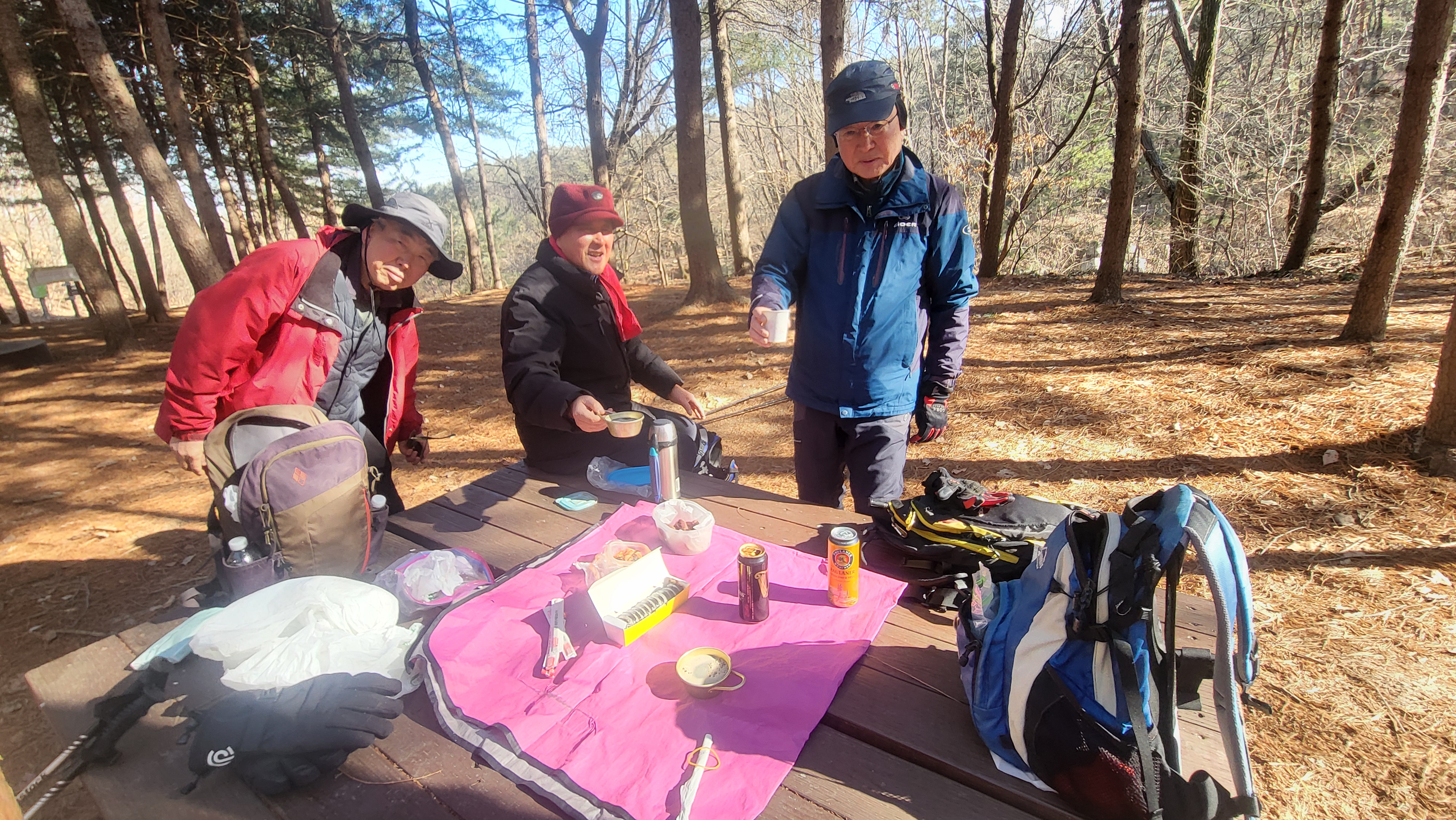 11시 17분 유아동네숲터에서 점심과 정상주.