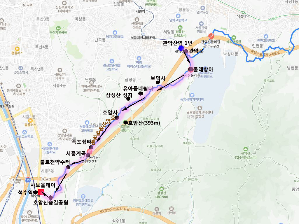 산행로: 관악산역 1번-관악문(관악산공원 정문)-호압사 갈림목 물레방아-보덕사 입구-유아동네숲터-삼성산 성지 앞-호압사 위-호암늘솔길-호암늘솔길 폭포쉼터-시흥계곡-불로천약수터-호암산숲길공원-석수역 앞 샤브올데이(7.3km, 3시간)
